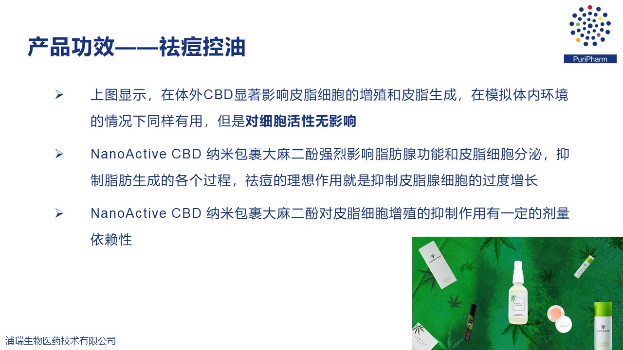 纳米包裹大麻二酚(NanoActive CBD)是一款具有舒缓抗炎、祛痘功效的“大麻提取物”,浦瑞生物医药公司通过培养人体皮脂细胞显示纳米包裹大麻二酚能够抑制脂肪生成的各个过程,并影响相关物质的分泌,包括花生四烯酸、亚油酸,甚至激活TRPV-4离子通道抑制皮脂腺细胞的增长,对寻常痤疮有一定治疗作用。NanoActive CBD对炎症因子的抑制有普遍作用,通过释放内源性大麻素,系统的抑制炎症的发生,调控已产生的炎症反应。
