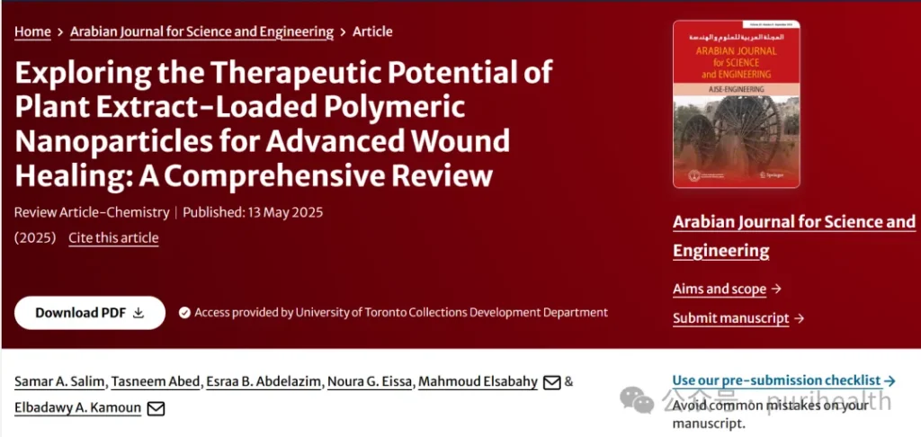 近年来,纳米技术的兴起为这一难题提供了全新的解决方案。一项发表于《 Arabian Journal for Science and Engineering》(影响因子=2.9)通过将姜黄素封装于聚合物纳米粒子中,研究人员成功提升了其稳定性、控制释放能力和皮肤渗透性,使其真正成为“智能愈合剂”。