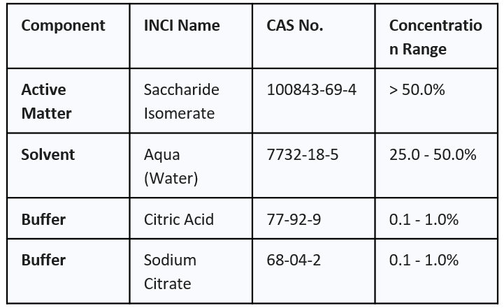 INCI Name (EU/US): Saccharide Isomerate, Aqua, Citric Acid, Sodium Citrate